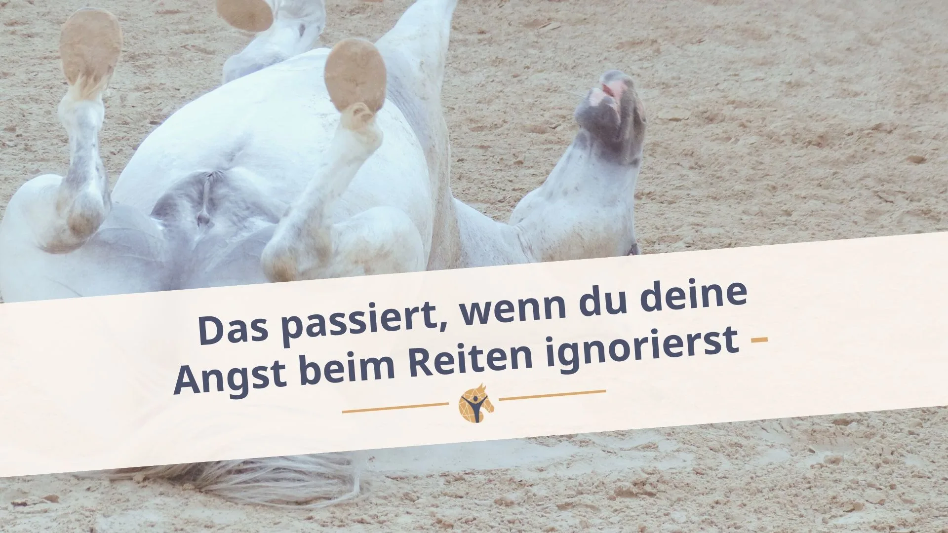 Bloggrafik: „Das passiert,wenn du deine Angst beim Reiten ignorierst“; Der PRE Schimmel Nino liegt auf dem Rücken im Sand und strampelt.Angst beim Reiten ist wie eine lahme Ausrede – am Anfang nervt sie nur ein bisschen, aber wenn du sie zu oft durchgehen lässt, bestimmt sie irgendwann den ganzen Tag. Und zwar nicht mit voller Wucht, sondern schön schleichend, wie nasse Socken in Reitstiefeln. Du fängst an, dich rauszureden: „Ich reite heute mal nicht, mein Pferd wirkt irgendwie verspannt.“ „Der Wind ist heute so böig.“ „Ich mach heute nur Bodenarbeit, ist auch wichtig.“ Und zack – bist du mittendrin. Nicht in der Halle, sondern im Vermeidungskarussell.