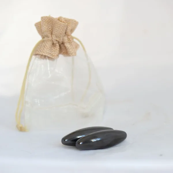 Du kaufst 1 Paar Hämatit Oliven, magnetisiert ca. 6 cm lang in einem wunderhübschen Geschenkbeutel.